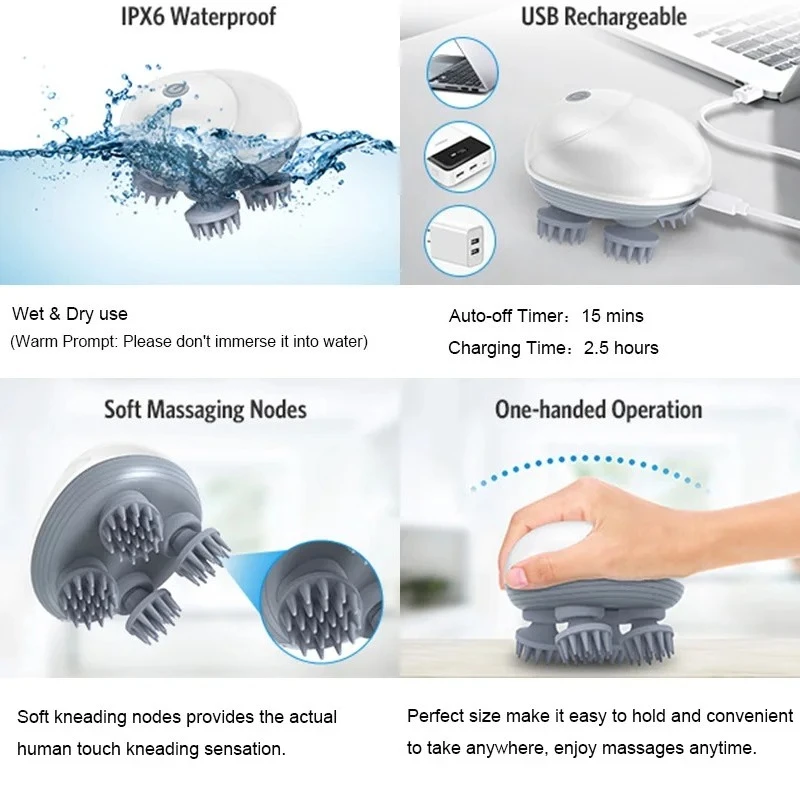 3. Comfortable Use: The head massager works by mimicking human fingers to help quickly reduce soreness and stiffness. The massage stimulation will increase blood flow to help tone and soften the skin.